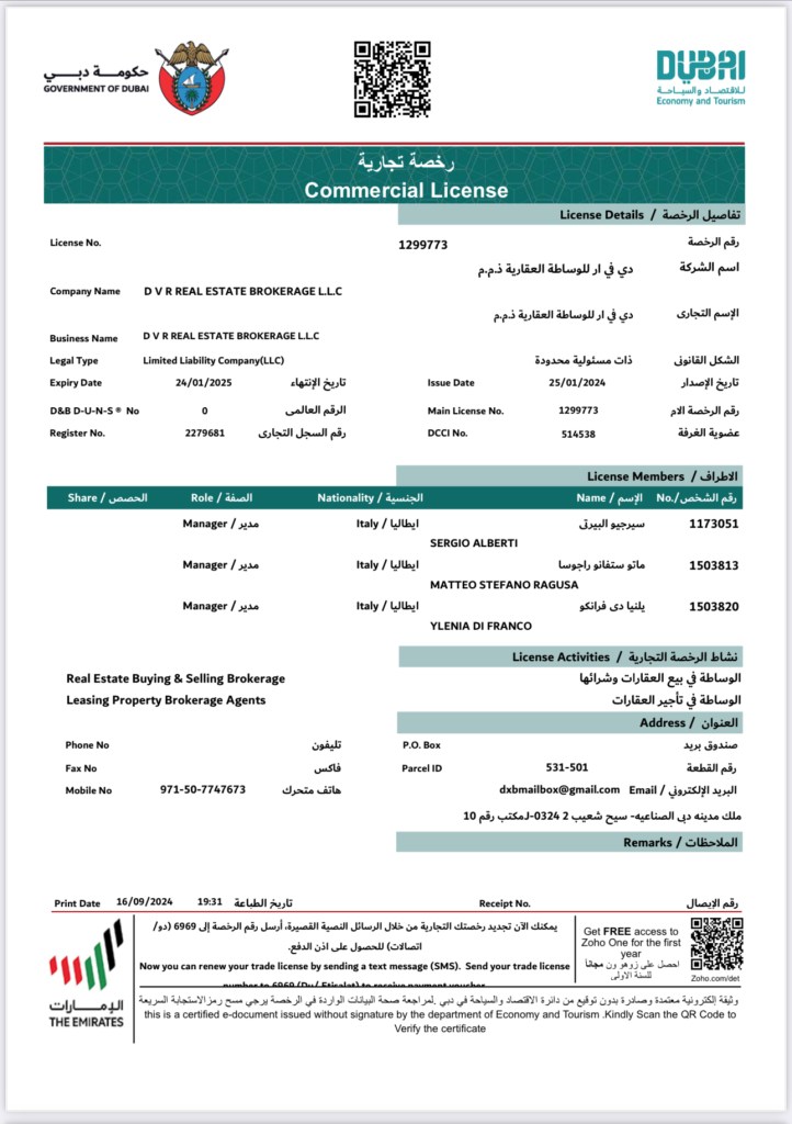 Passiamo poi alla Dubai Connection: D V R Real Estate Brokerage L.L.C., una società che promette mari e monti nel settore immobiliare. Con tre manager italiani (tra cui Matteo, ovviamente) e un misterioso 40%-40%-20% di quote che sembrano più un gioco di prestigio che una vera suddivisione societaria, questa azienda offre la solita mancanza di trasparenza. Il numero di telefono c’è, l’indirizzo email è generico, ma di case comprate o vendute neanche l’ombra. Forse si tratta di un’azienda di “real estate invisibile”, specializzata in vendite… che non si vedono.