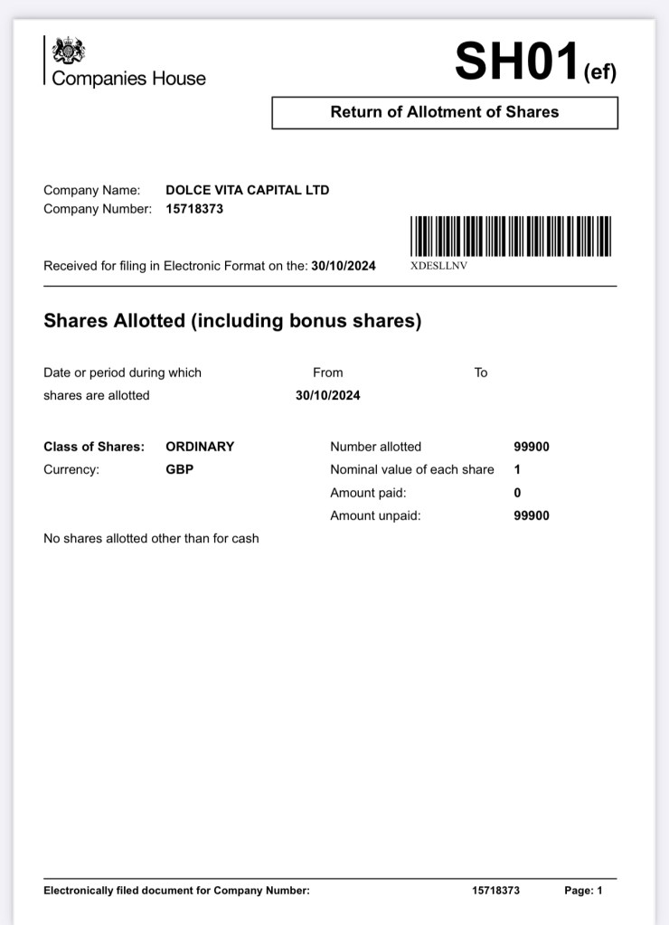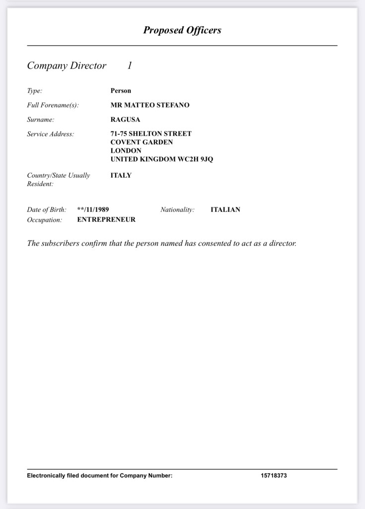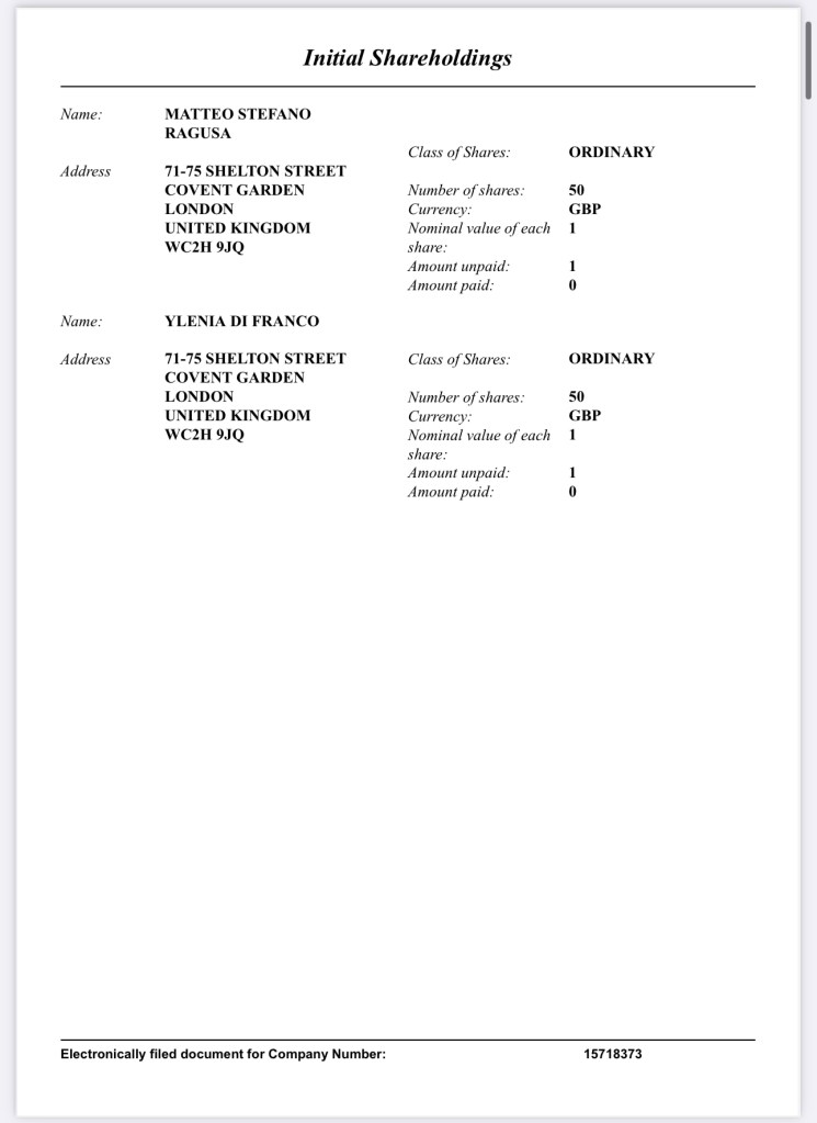 Matteo Stefano Ragusa si supera con questa perla made in UK. Con un aumento di capitale impressionante fino a 99.900 sterline, ci si aspetterebbe di vedere investimenti, progetti, persino un ufficio. E invece? Nulla di nulla. Non è stato versato neanche un centesimo! E mentre gli azionisti (sempre lui e la fidata Ylenia Di Franco) sembrano guardare lontano con sguardi sognanti, la società rimane una scatola vuota con indirizzo fittizio a Covent Garden, Londra. Un capolavoro di strategia: tanto capitale nominale e zero responsabilità reale. Un sogno per il management, un incubo per chiunque pensi di investire.