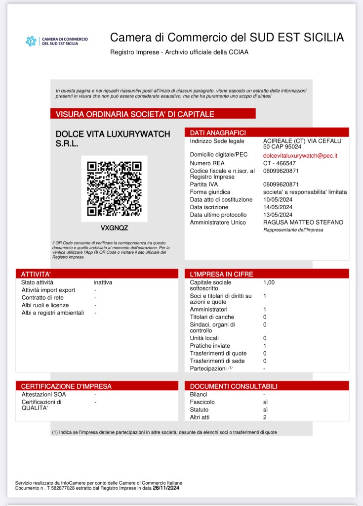 Presentata come l’azienda destinata a rivoluzionare il mondo dell’orologeria di lusso, Dolce Vita Luxurywatch S.R.L. è in realtà più immobile di un vecchio orologio da parete con le batterie scariche. Con un capitale sociale da record di 1 euro(sì, hai letto bene: UNO!), e uno stato di inattività che grida “non abbiamo mai nemmeno iniziato”, questa società rappresenta il simbolo dell’”imprenditoria statica”. Matteo, unico proprietario, sembra aver deciso che la dolce vita non prevede nemmeno la fatica di far partire l’azienda. Un’eccellenza nel non fare assolutamente nulla.